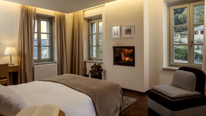 Monopatia is defined by a calm, refined atmosphere shaped by its natural surroundings. Interiors reflect the landscape through earthy tones and materials, while each space maintains its own character and understated comfort. The property comprises fourteen buildings in total, most dating back to the 19th century and carefully restored in 2010, respecting the local architectural tradition.